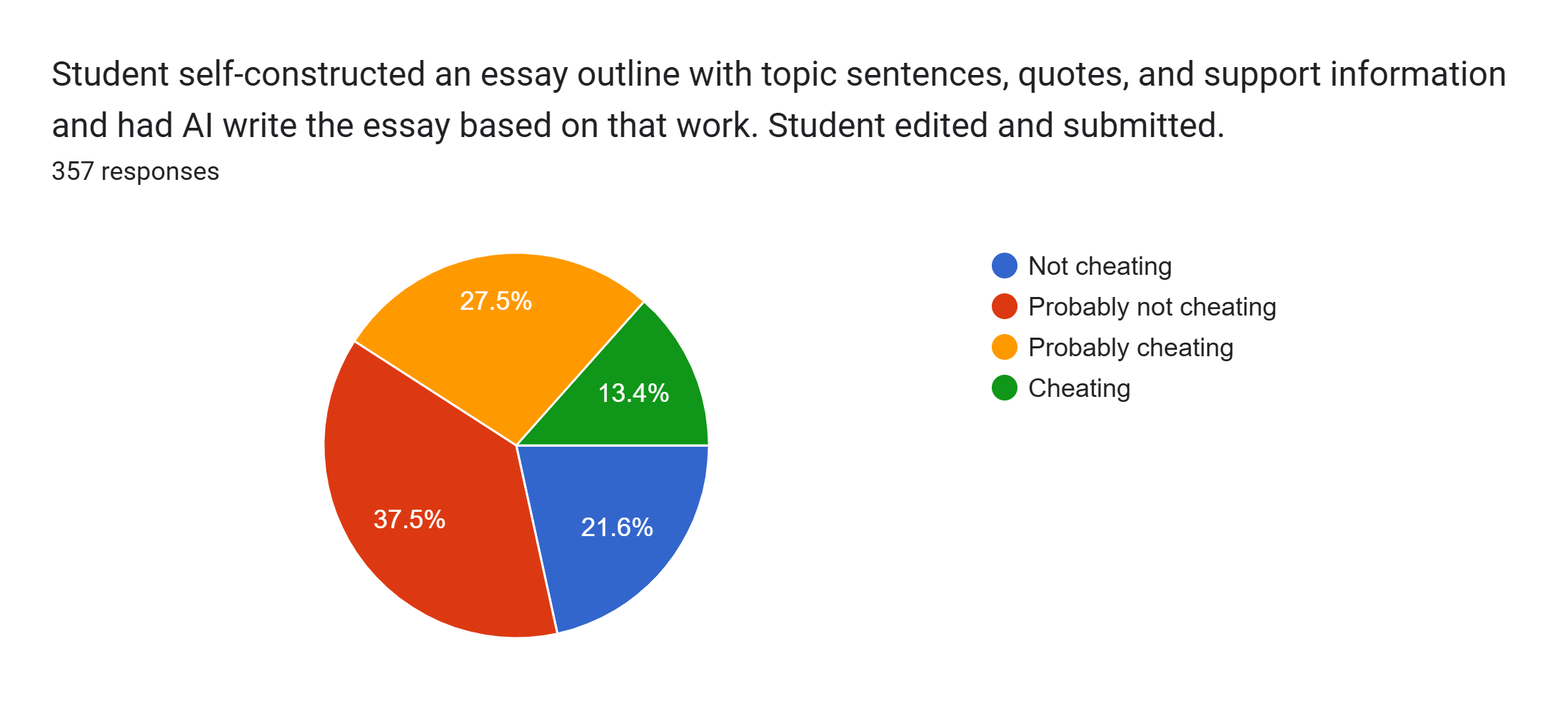 This example shows how effort sits at the heart of the debate. Some argue that building an outline demonstrates ownership and learning, while others see handing off the draft essay as crossing a line. Ghostwriting has always raised questions about authenticity, and AI makes that tension more persistent, more easily blurring the boundary between acceptable assistance and dishonest outsourcing. The disagreement suggests that perceptions hinge on how much intellectual labor the student is seen as doing versus passing off to the machine.